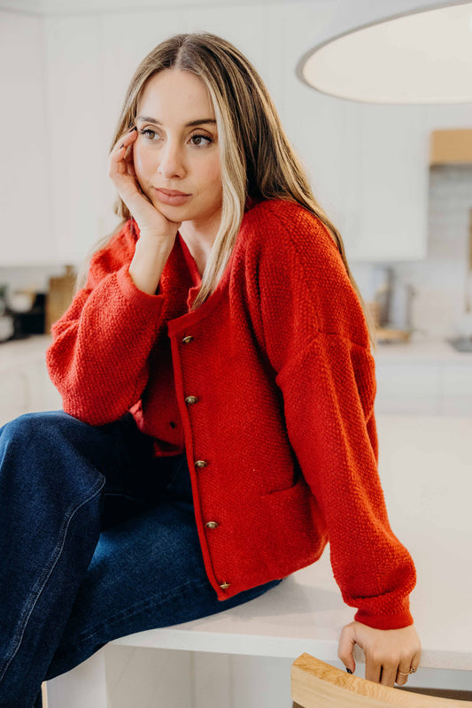 BUTTON FRONT CARDI IN RIBBON RED