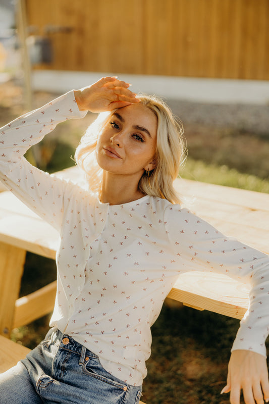 POINTELLE BUTTON CARDIGAN IN MAUVE BOWS
