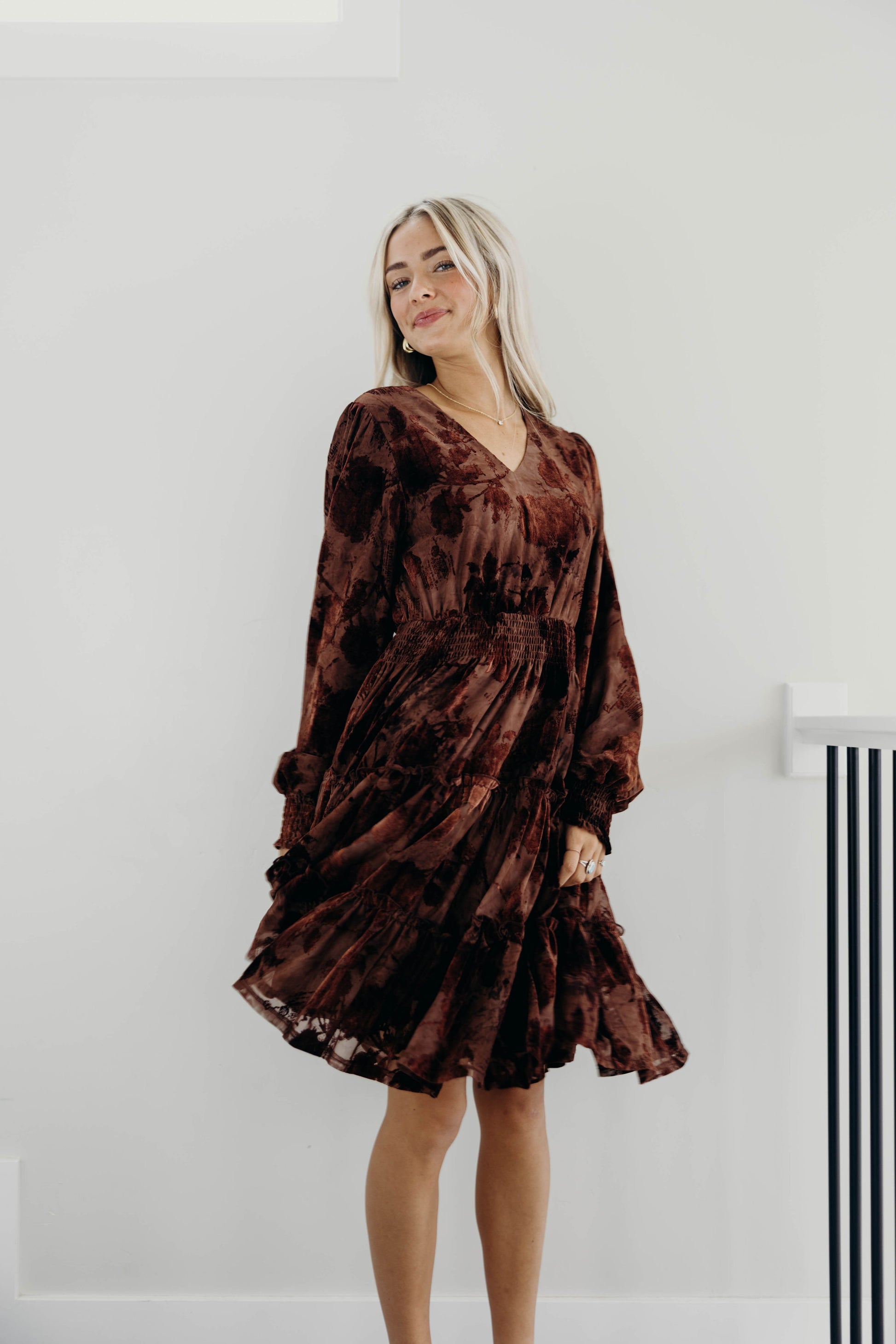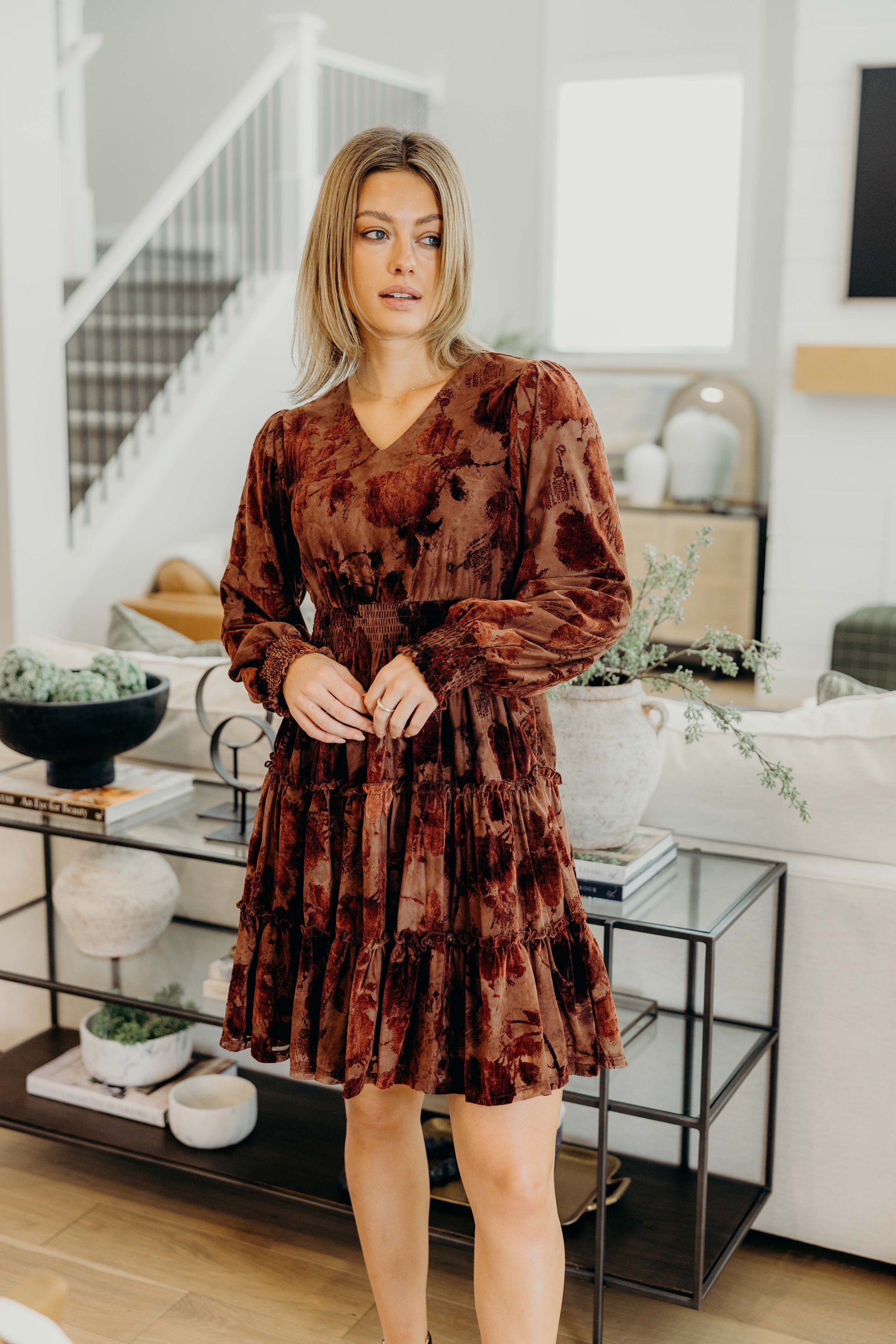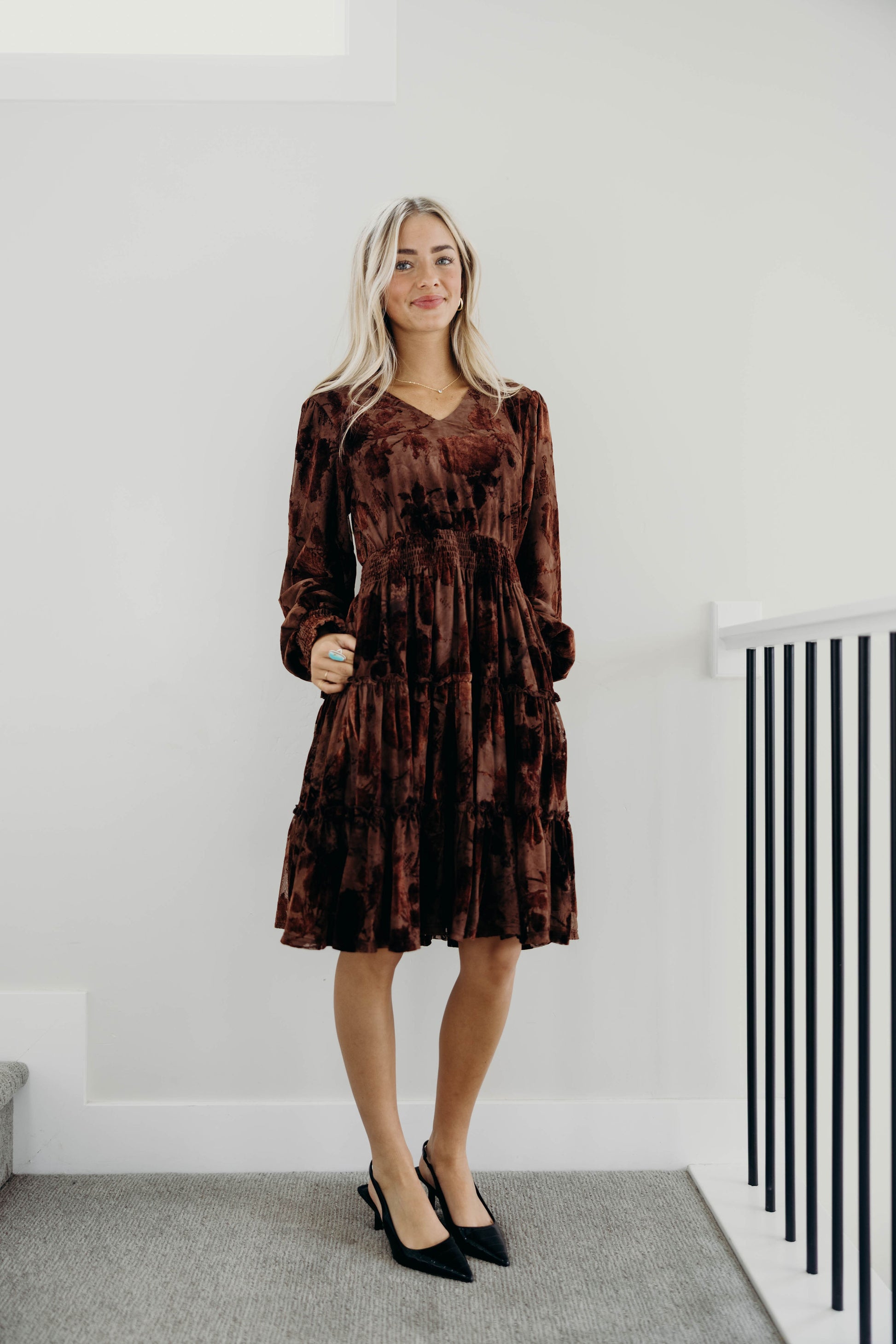 Knee length dress with tiered skirt, smocked waist, v neckline, and long sleeves.