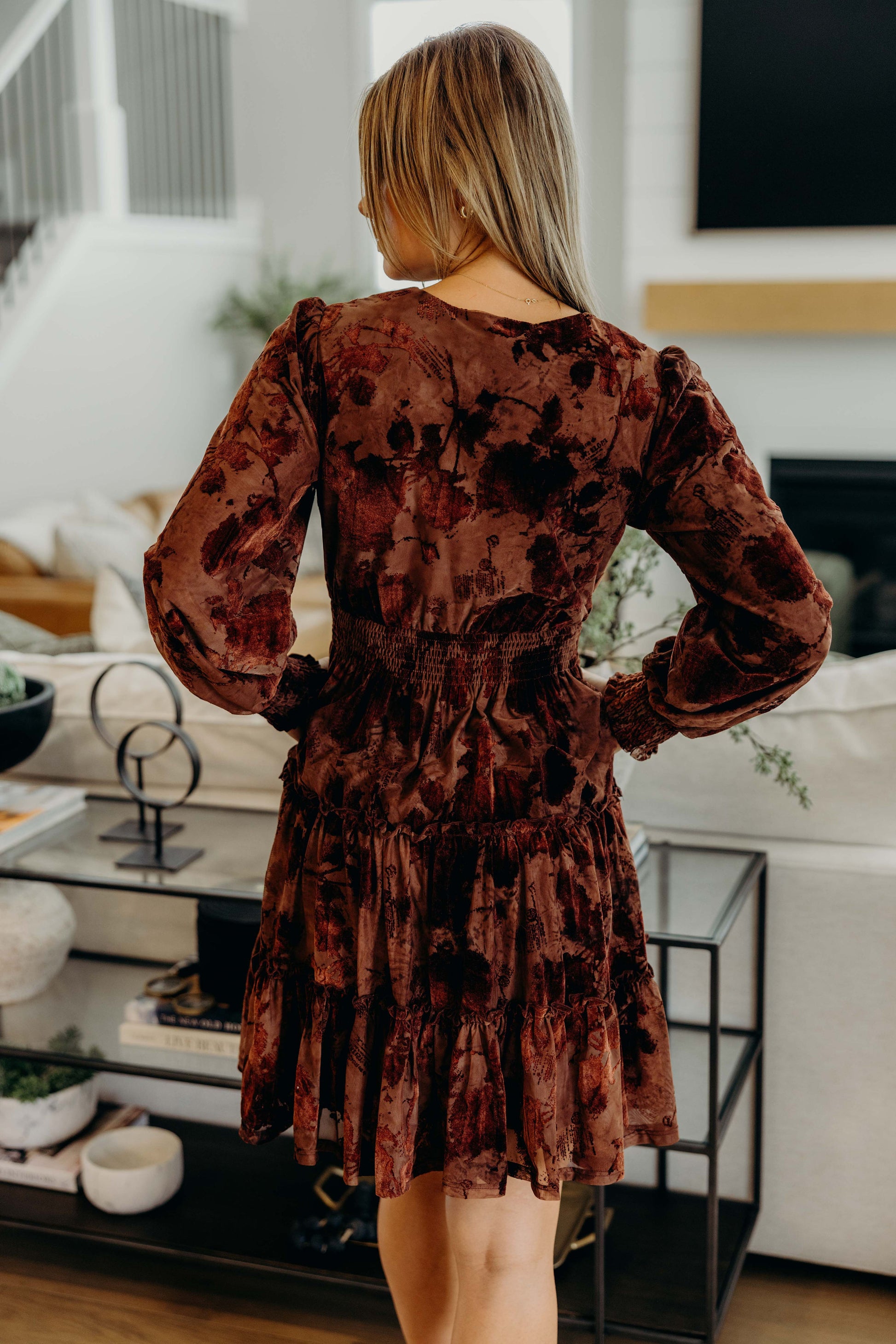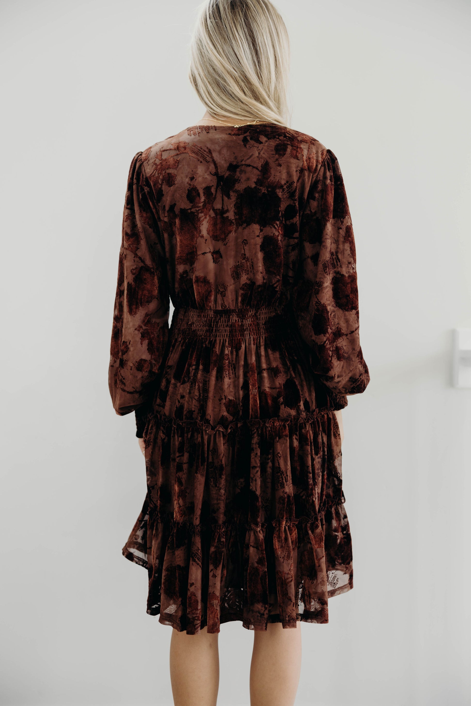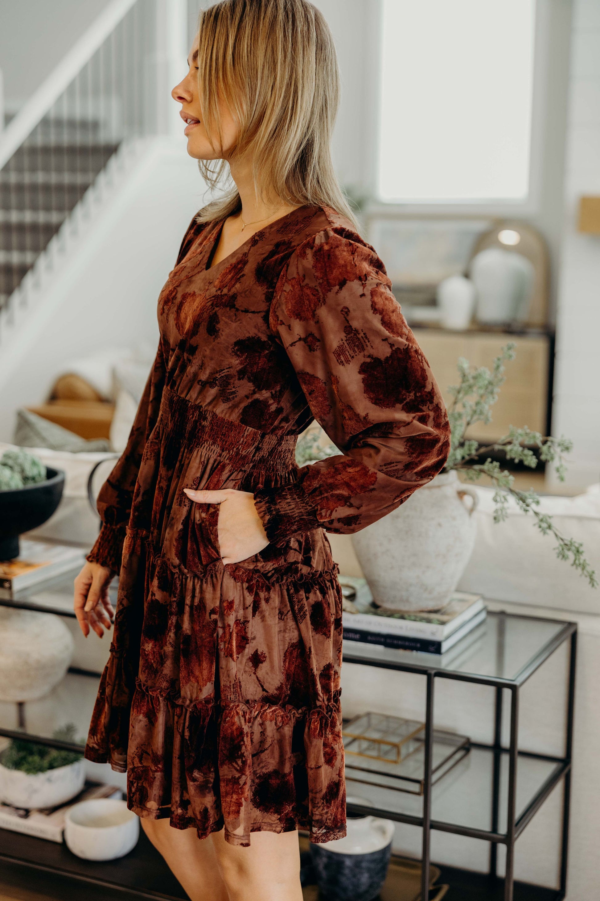 Knee length dress with tiered skirt, smocked waist, v neckline, and long sleeves.
