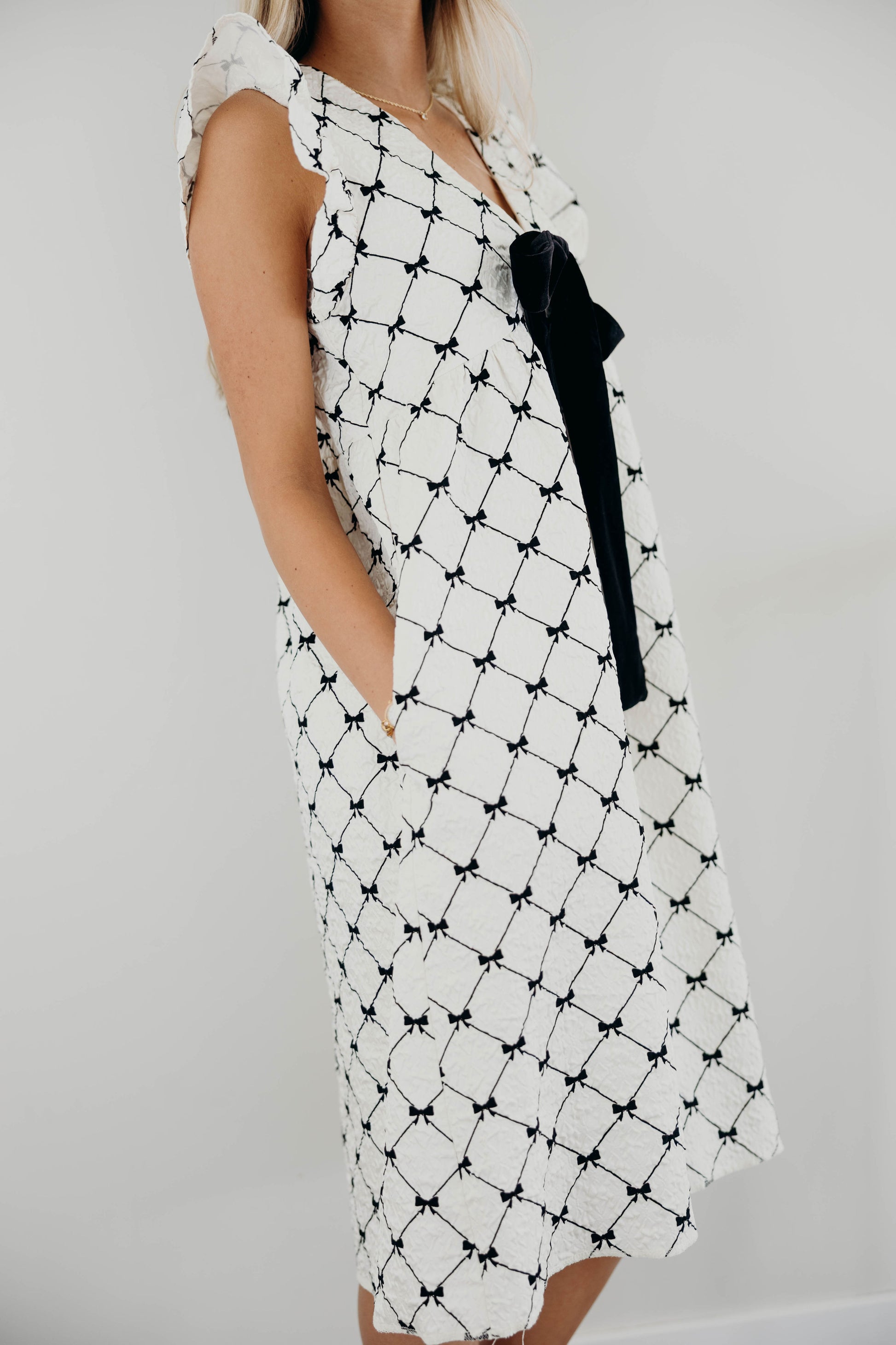 Midi length dress with v neckline, ruffle sleeves, empire waist, keyhole closure in back, bow detail, and pockets.