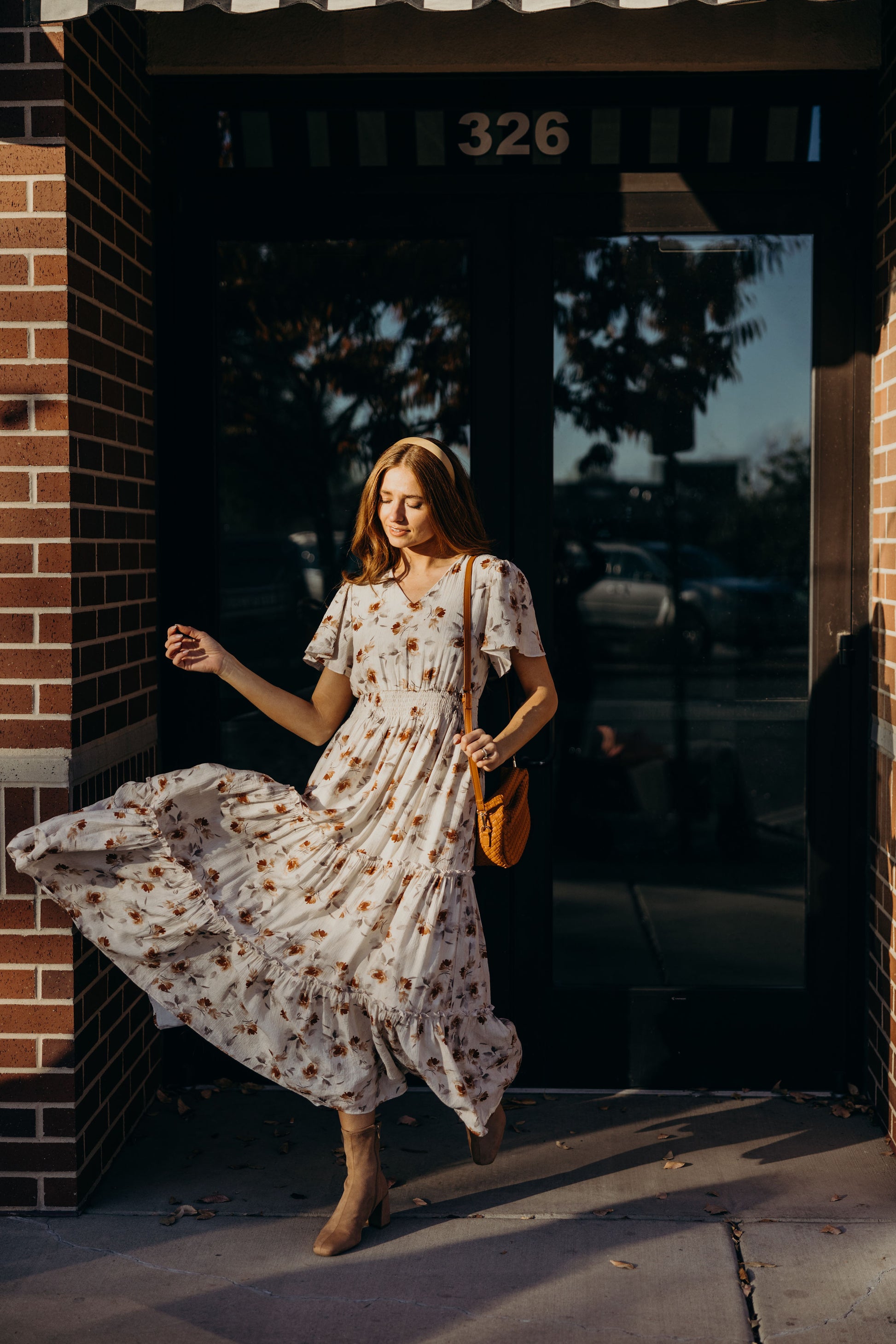 Full-length dress with a tiered skirt, elastic waist, v-neckline and flutter sleeves.