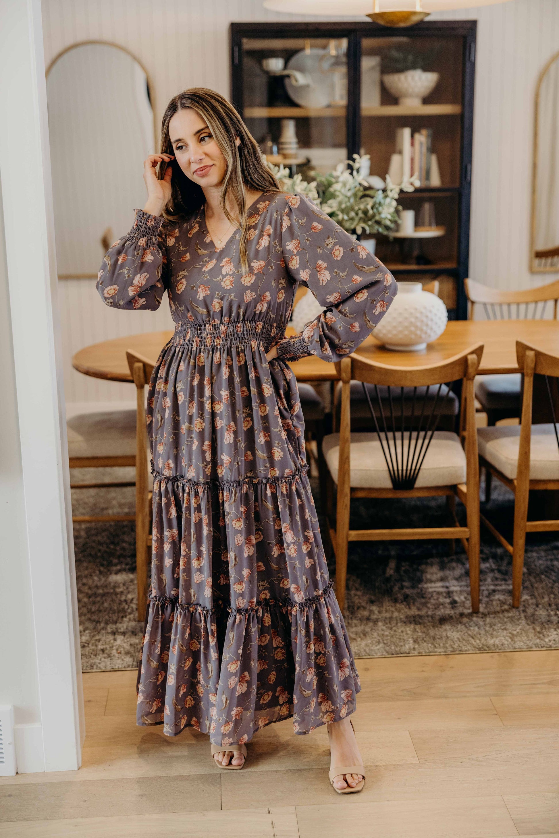 Maxi length dress with long sleeves, tiered skirt, smocked waist and cuffs, v neckline, and pockets.