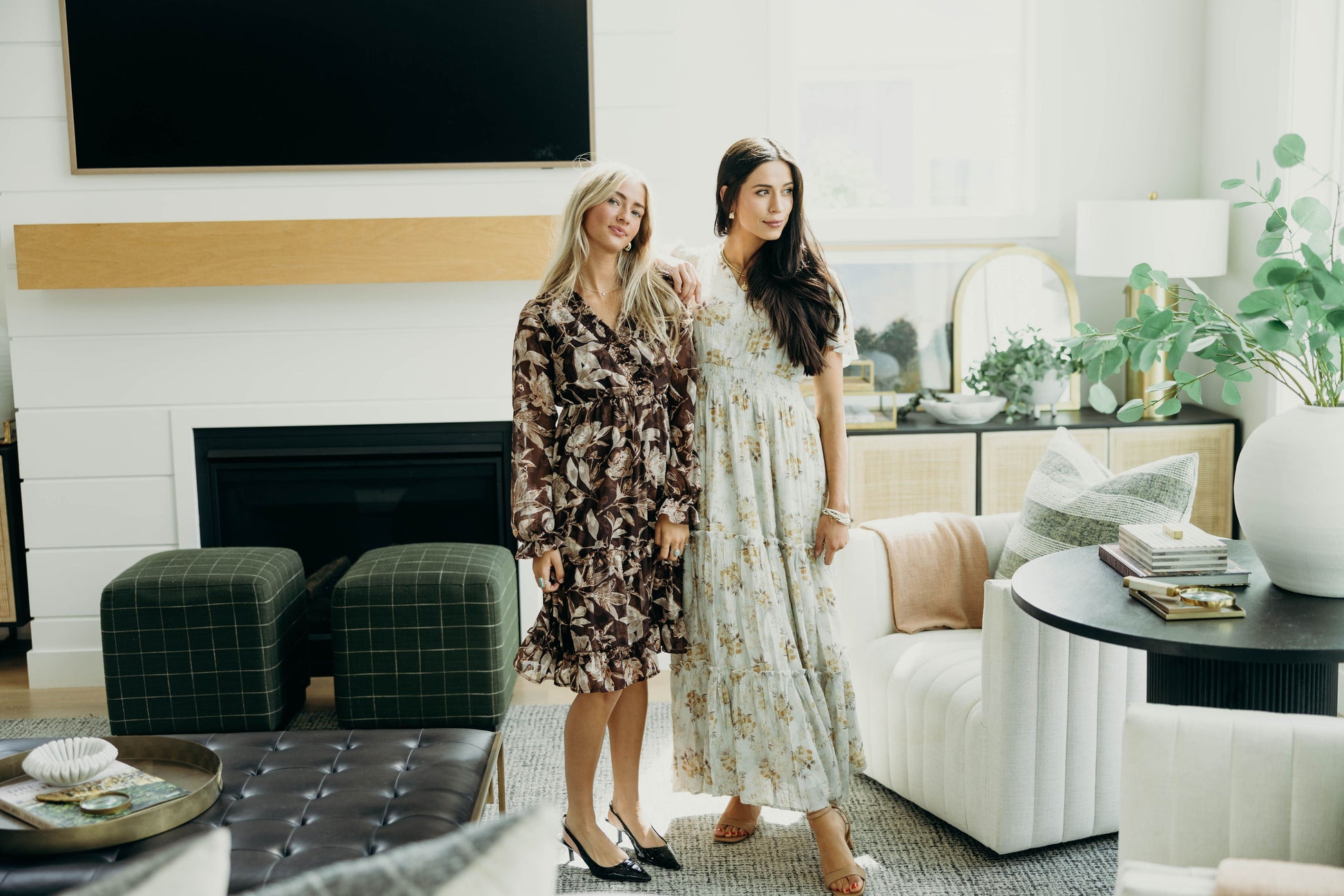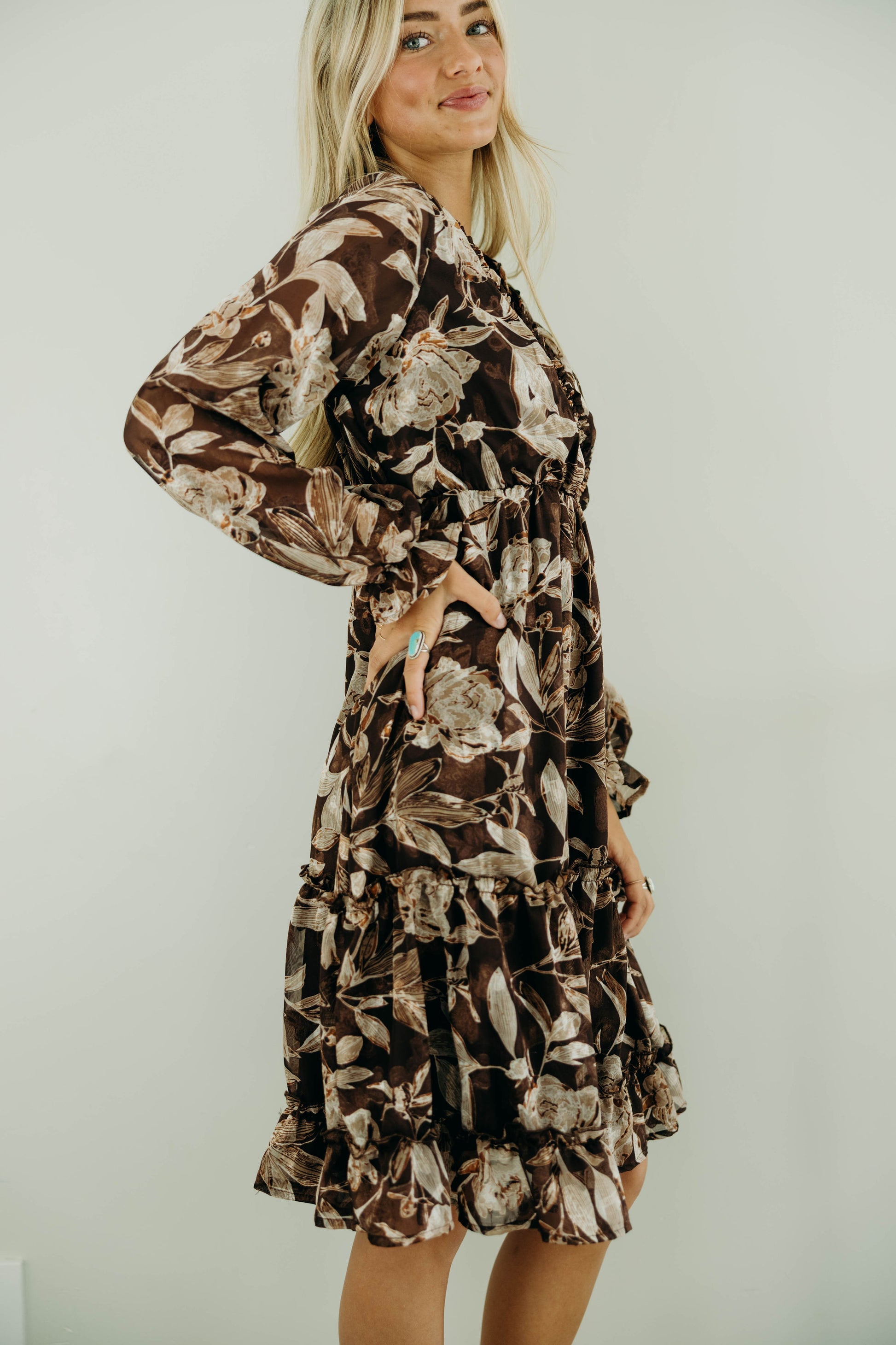 Knee length faux wrap dress with long sleeves, v neckline, tiered skirt and smocked detail.