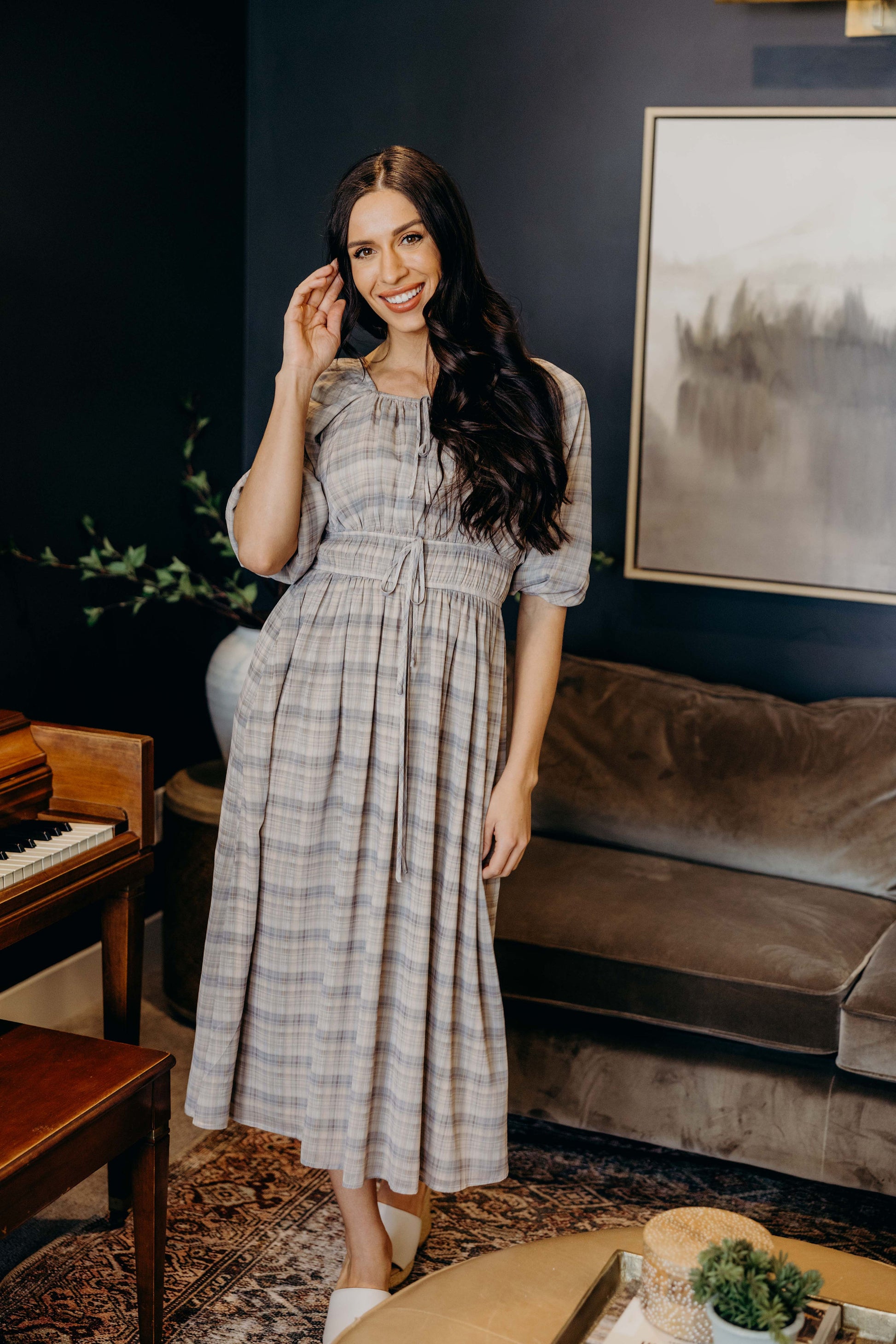 Midi length dress with a line silhouette, Square neckline, elastic waist, 3/4 sleeves, and tie details.