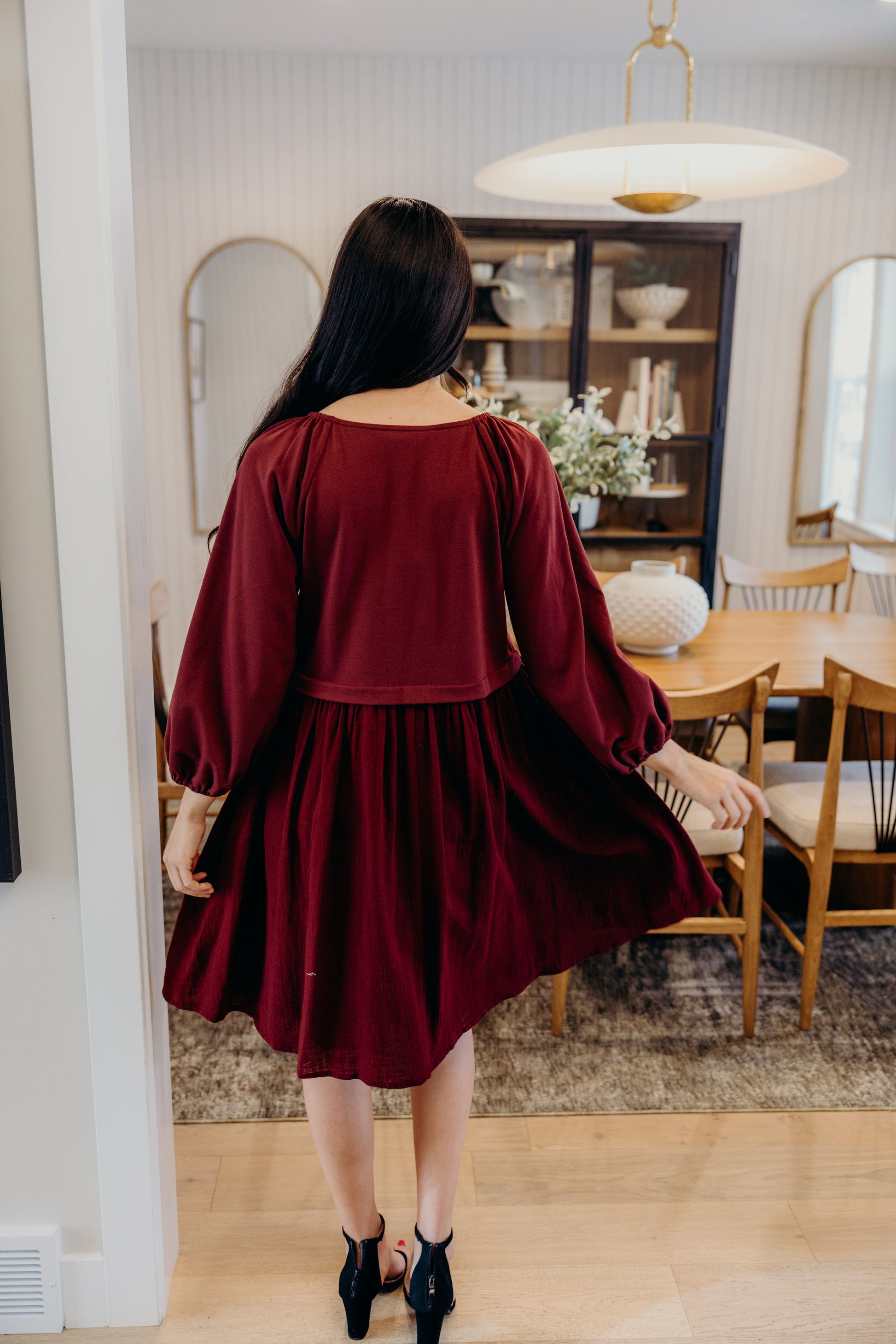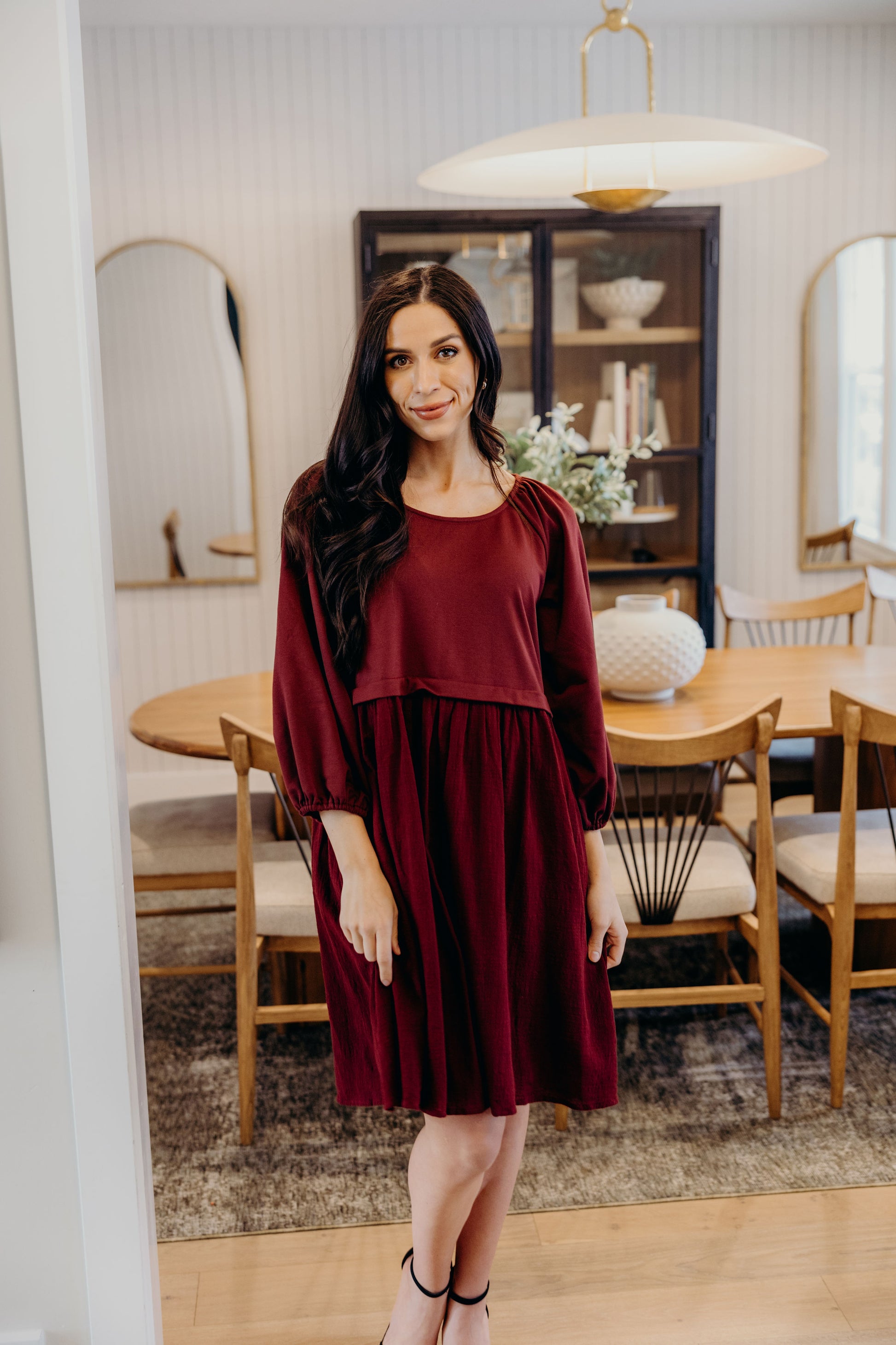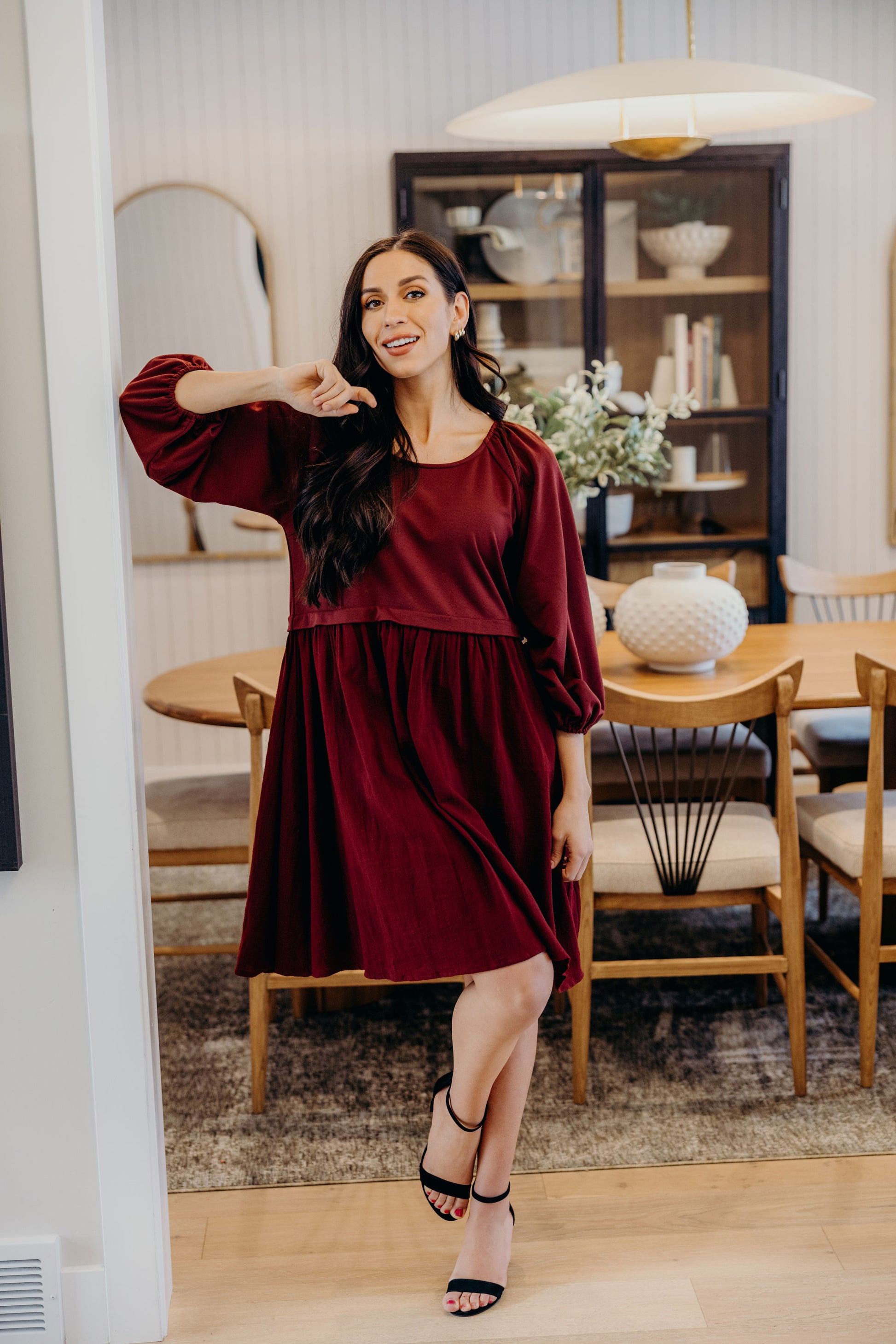 Knee-length dress with ¾ sleeve with elastic cuffs, with relaxed fit empire waist.