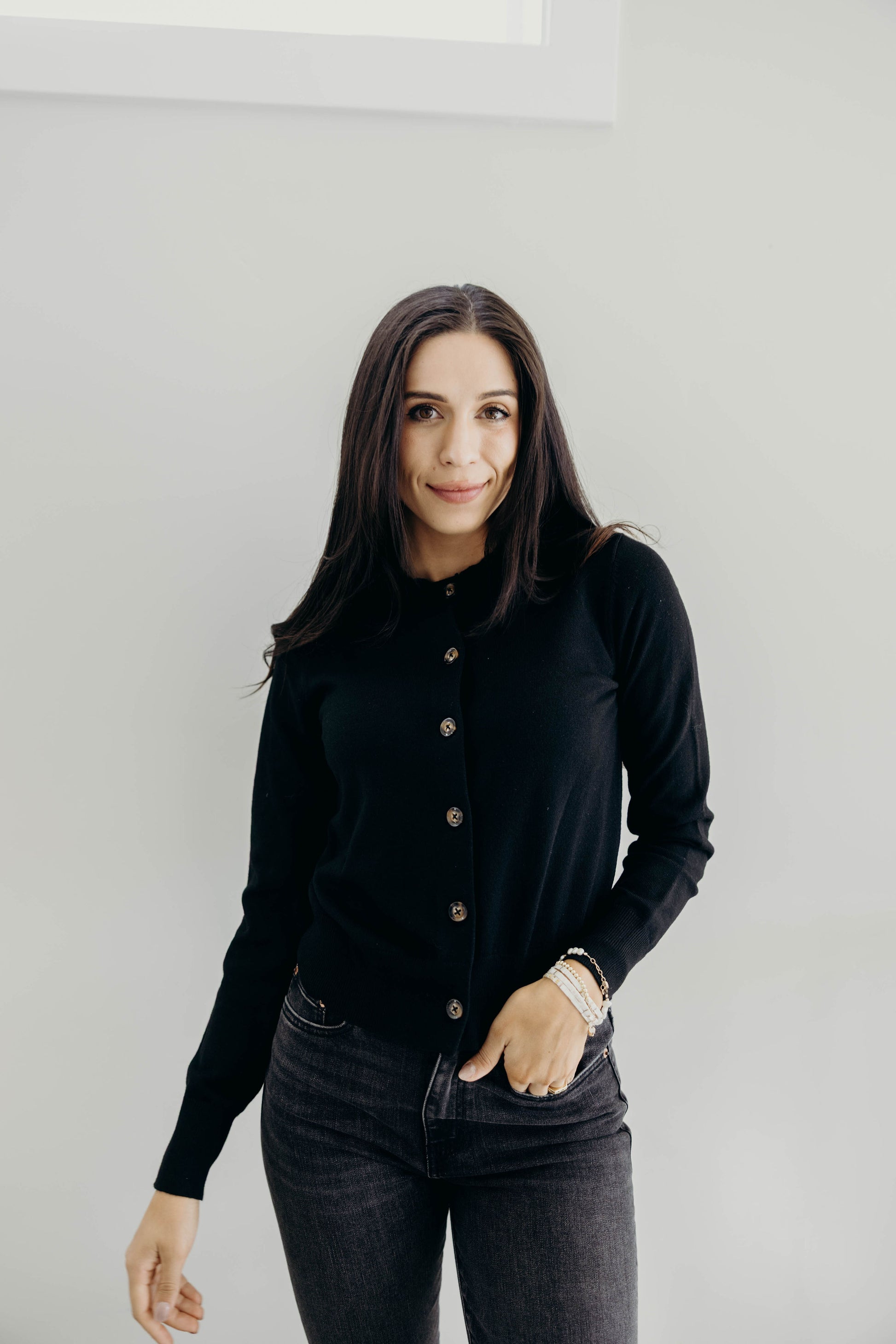 Long sleeve button up cardigan with a round neckline and ribbed cuffs and collar.