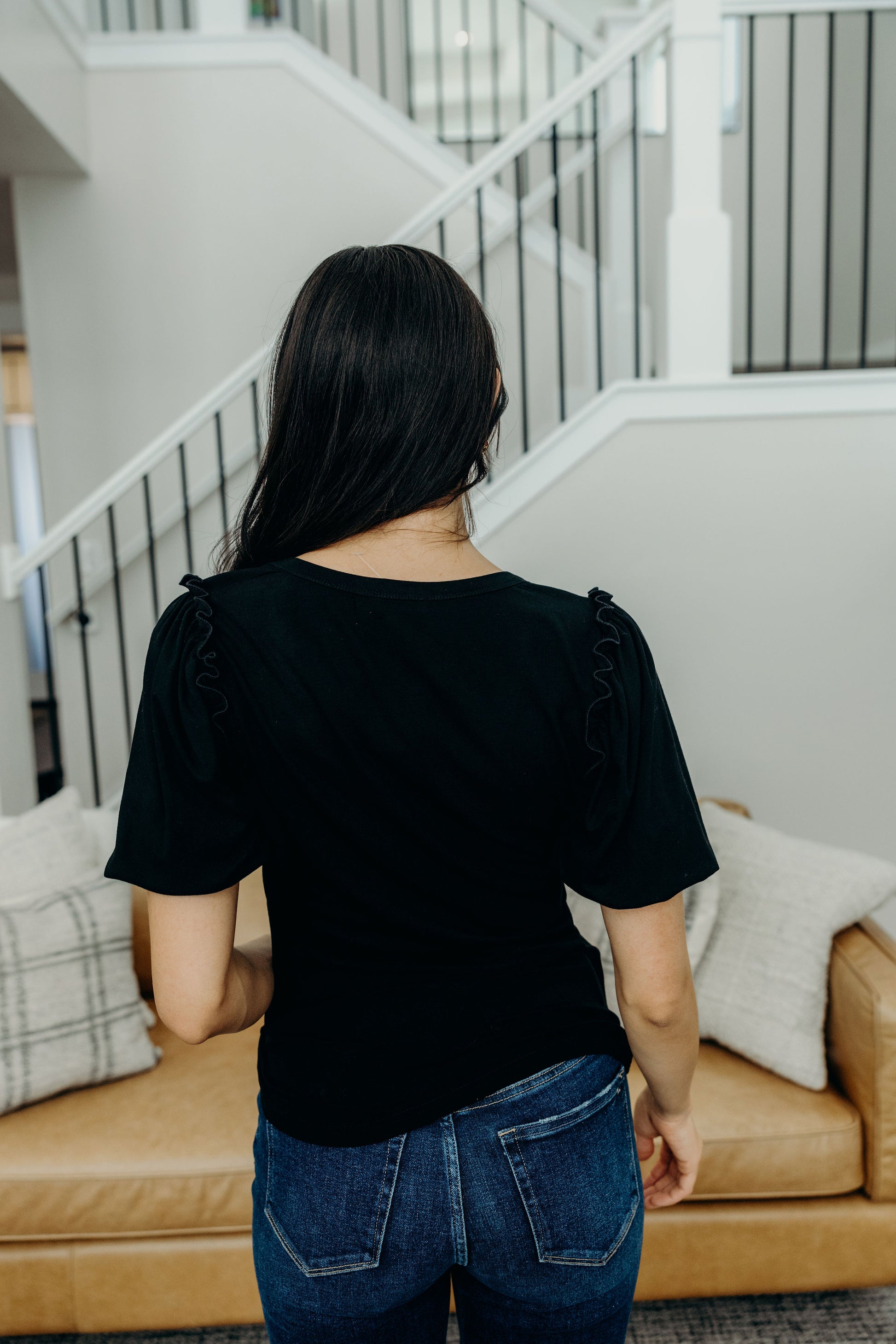 Short sleeve tee with ruffle detail on shoulder, round neckline and bubble sleeve.
